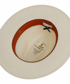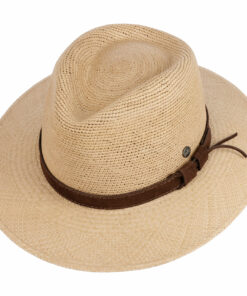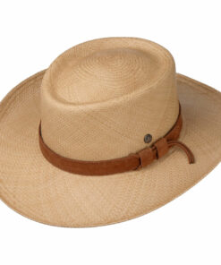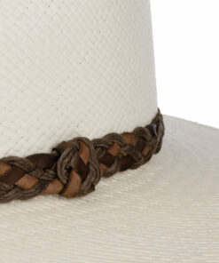 This Western hat is made by hand from high-quality Panama straw in a tradition-consciously authentic shape. It wins over the wearer qualitatively with summery lightness and the flexible, slightly airy workmanship. The visual arguments of the straw hat are the subtle heathered design and the colourful patterned trim band made of fabric with side bow and brand pin, which is shown off to excellent effect on it.