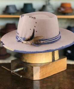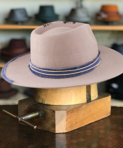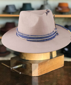 The “Classic Wide Brim Outdoor Hat”. This stylish fedora features a 4 1/2″ crown and a 3 3/4″ brim, perfect for adding a touch of sophistication to your look. The hat is adorned with a unique feather blue patchwork and band, giving it a distinctive and eye-catching appeal.