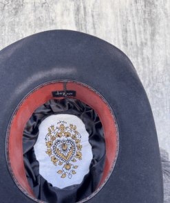 “Ebony Blue Vintage Felt Cowboy Hat” is hand-distressed, hand-dyed, and hand-torched, ensuring no two share the same color or design. Each piece is uniquely imperfect, with subtle variations from product images.