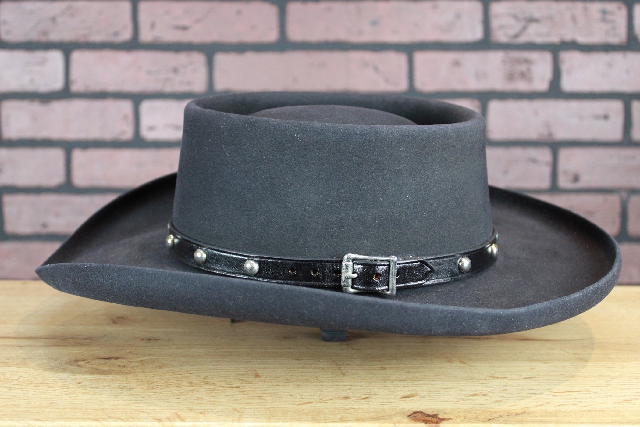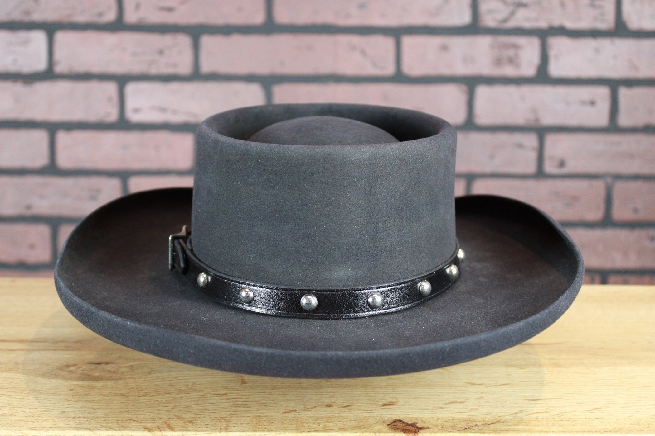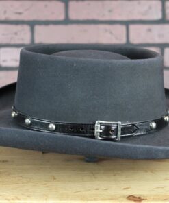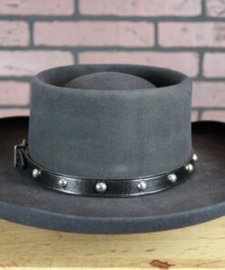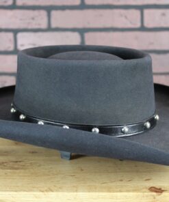 We are proud to offer this replica for any Boza super fan. Our replica Adam hat is hand blocked with a telescope crown and the brim is finished with a loose pencil roll. The leather hatband is hand cut and finished metallic studs spaced 1.5″ apart and closed with a silver buckle. Made in the original color “Black”.
