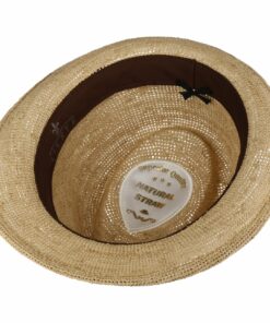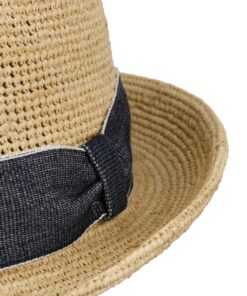 Made from 100% straw, this hat has an attractive crochet look and fits harmoniously into the summer leisure wardrobe. The chic hat can be flexibly combined with a linen suit or jeans and a T-shirt. A wide denim-look trim band with a contrasting braid gives the Italian-made straw hat a particularly casual look.