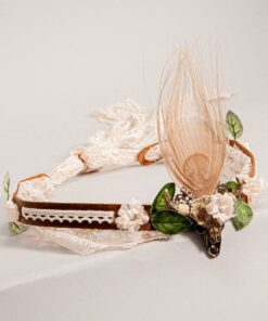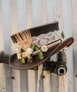This goregous hatband uses a leather band as its base. The leather is srapped in lace which gives a touch of elegance. The leaves and feather on front paired with the skull make this hatband very unique.